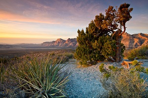 Location Las Vegas is on the floor of the Mojave Desert surrounded by mountain ranges on all sides. The landscape is rocky, arid and subject to torrential flash floods.